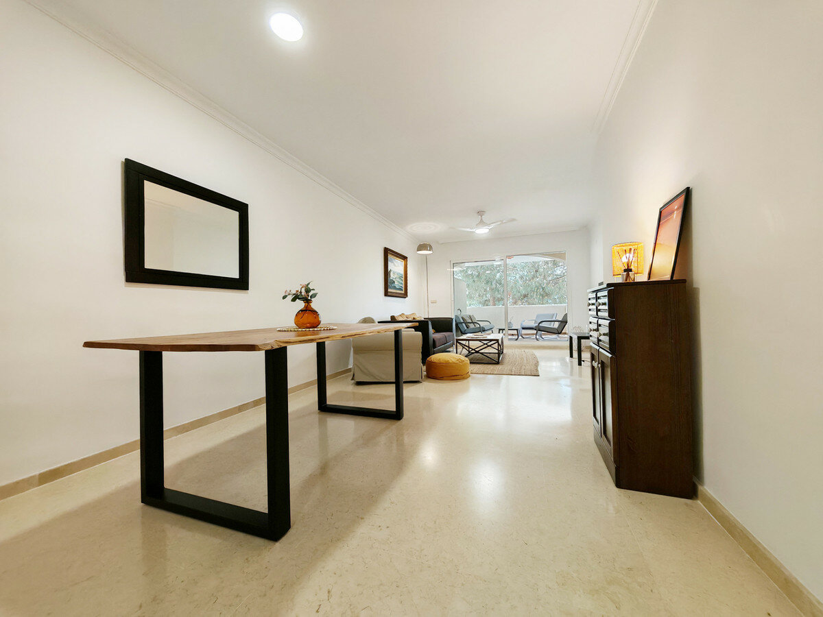 Apartment for rent in Elviria, Marbella with 2 bedrooms, 2 bathrooms, 1 on suite bathroom and with orientation south/west, with communal swimming pool, communal garage (1 parking spaces) and communal garden. Regarding property dimensions, it has 123 m² built and 16.25 m² terrace. Has the following facilities amenities near, air conditioning, fully furnished, fully fitted kitchen, marble floors, private terrace, kitchen equipped, water tank, country view, indoor pool, laundry room, internet - wi-fi, covered terrace, fitted wardrobes, gated community, lift, close to sea / beach, close to golf, balcony, excellent condition, ceiling cooling system, close to town, close to schools, surveillance cameras, inside golf resort and close to restaurants.