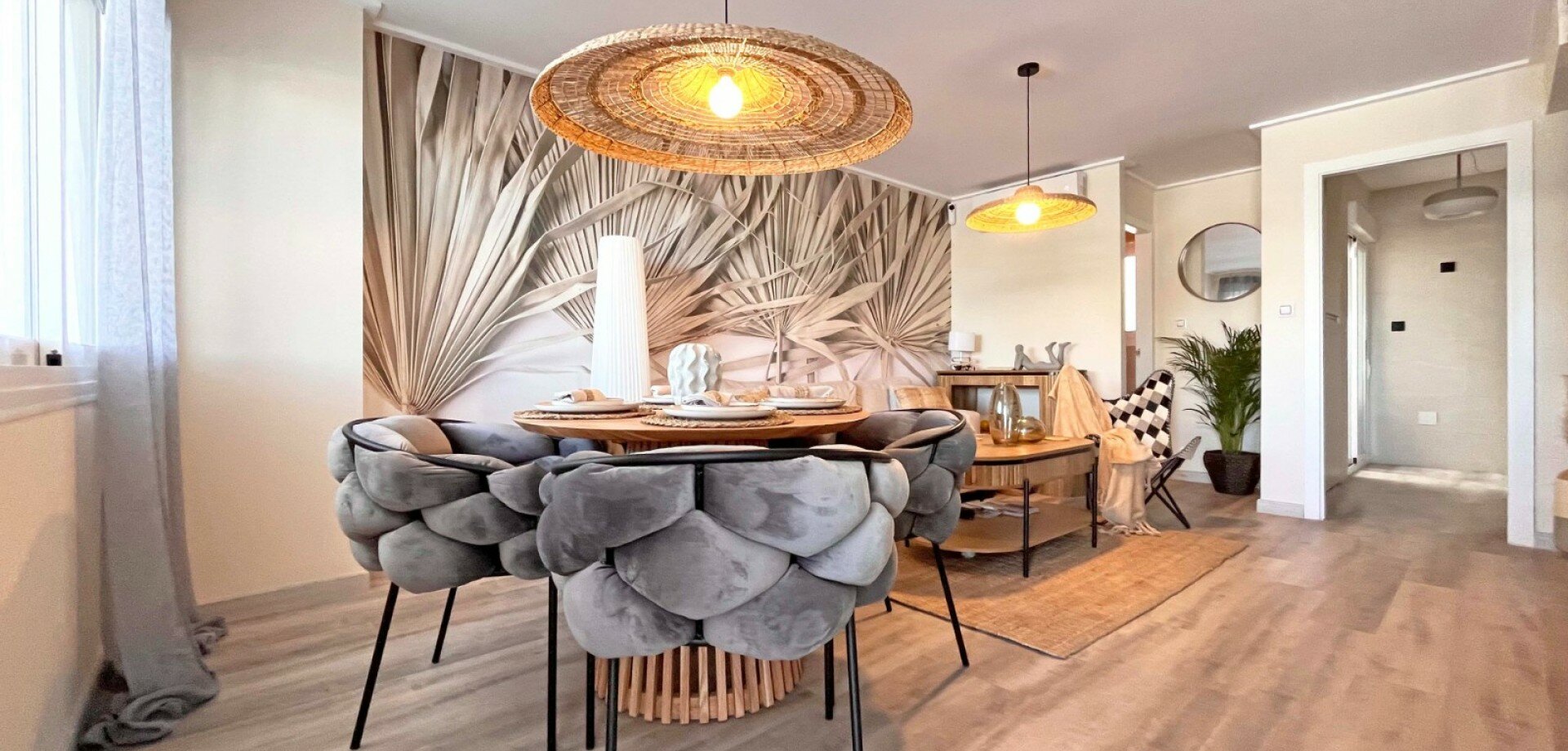 Step inside to find a bright and airy interior, fully furnished with contemporary decor. The separate modern kitchen comes fully equipped, making meal preparation a pleasure. Enjoy the luxury of multiple outdoor spaces, including a ground floor terrace ideal for al fresco dining, a private balcony overlooking the serene communal pool, and a stunning roof terrace with breathtaking views of the famous pink salt lake.