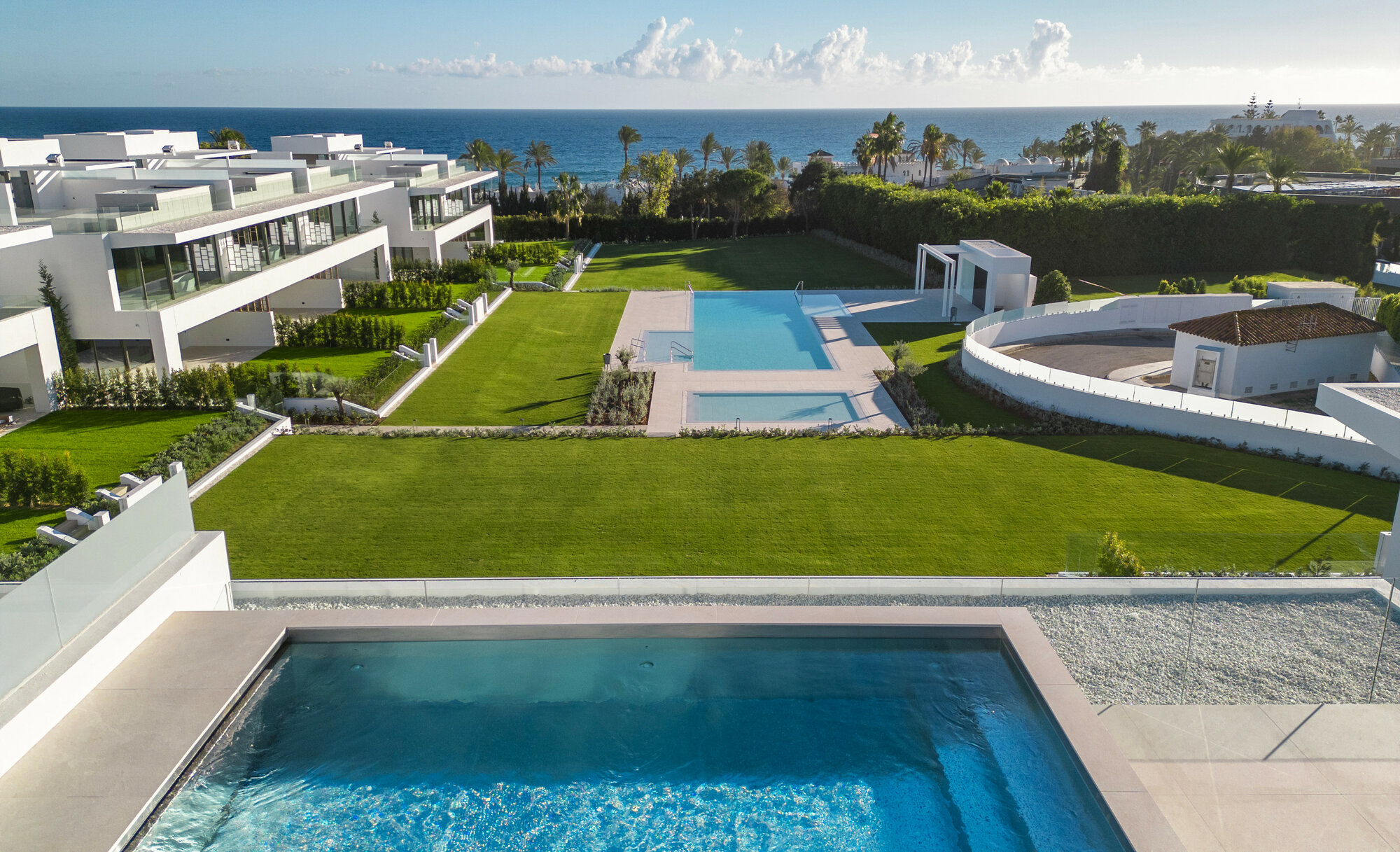 Stunning brand new semi-detached villa on the exclusive Marbella Golden Mile, with second to none sea views and part of a luxurious community of stylish properties with a sublime design. Just a minute away from the 5-star luxury Puente Romano Hotel & Resort along with the beach side promenade and glistening Mediterranean beyond, these exceptional residences in a gated community are built to the highest of specifications with premium quality materials, each over 4 floors. The feature the latest Domotic system, impeccable interior design by Pedro Pena, lift to all floors, four large parking spaces in the underground garage. One exceptional feature is the rooftop solarium with plunge pool, cinema, outdoor kitchen and outstanding panoramic views.