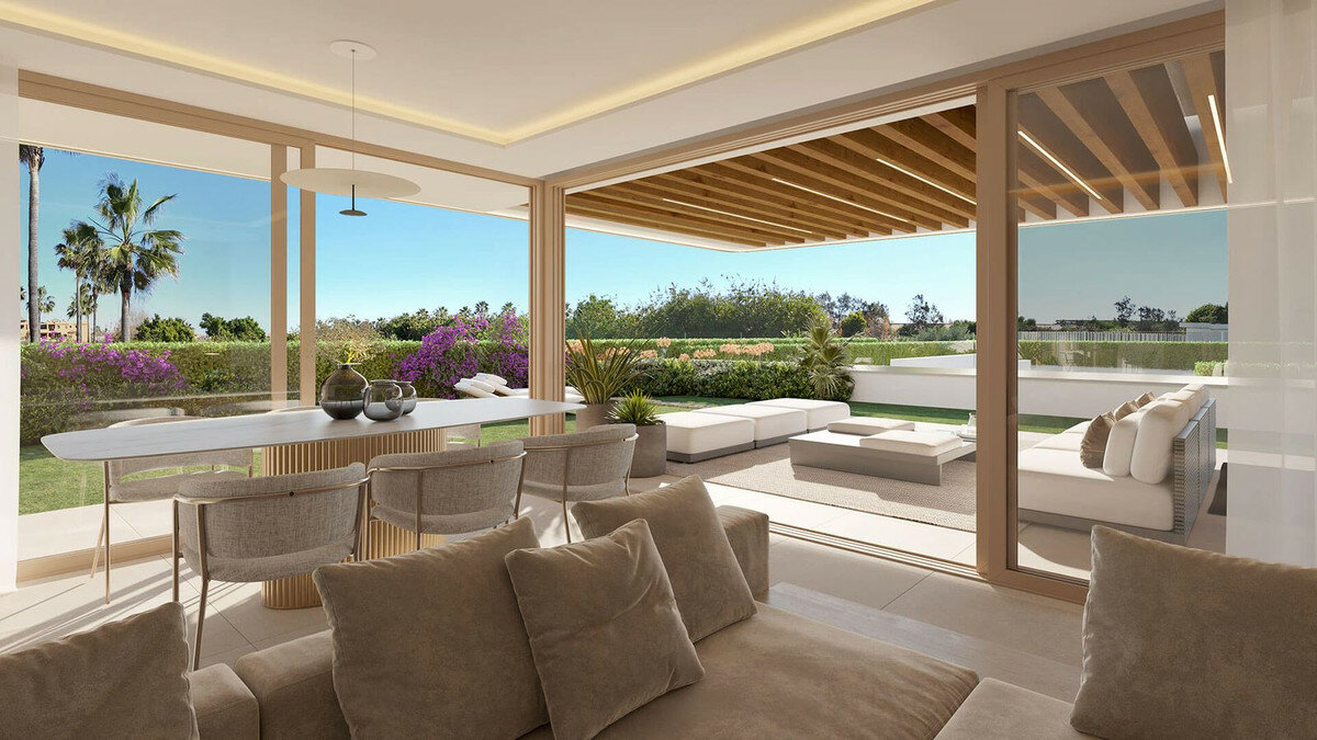 The residences include 2- and 3-bedroom apartments designed with space and natural light in mind. Living rooms feature large windows and sliding doors with direct access to private outdoor areas. Kitchens come fully fitted with modern appliances and high-quality finishes. Options include ground-floor apartments with private gardens, mid-level homes with spacious terraces, and luxury penthouses with rooftop solariums and private pools. Each property includes a private parking space and storage room.