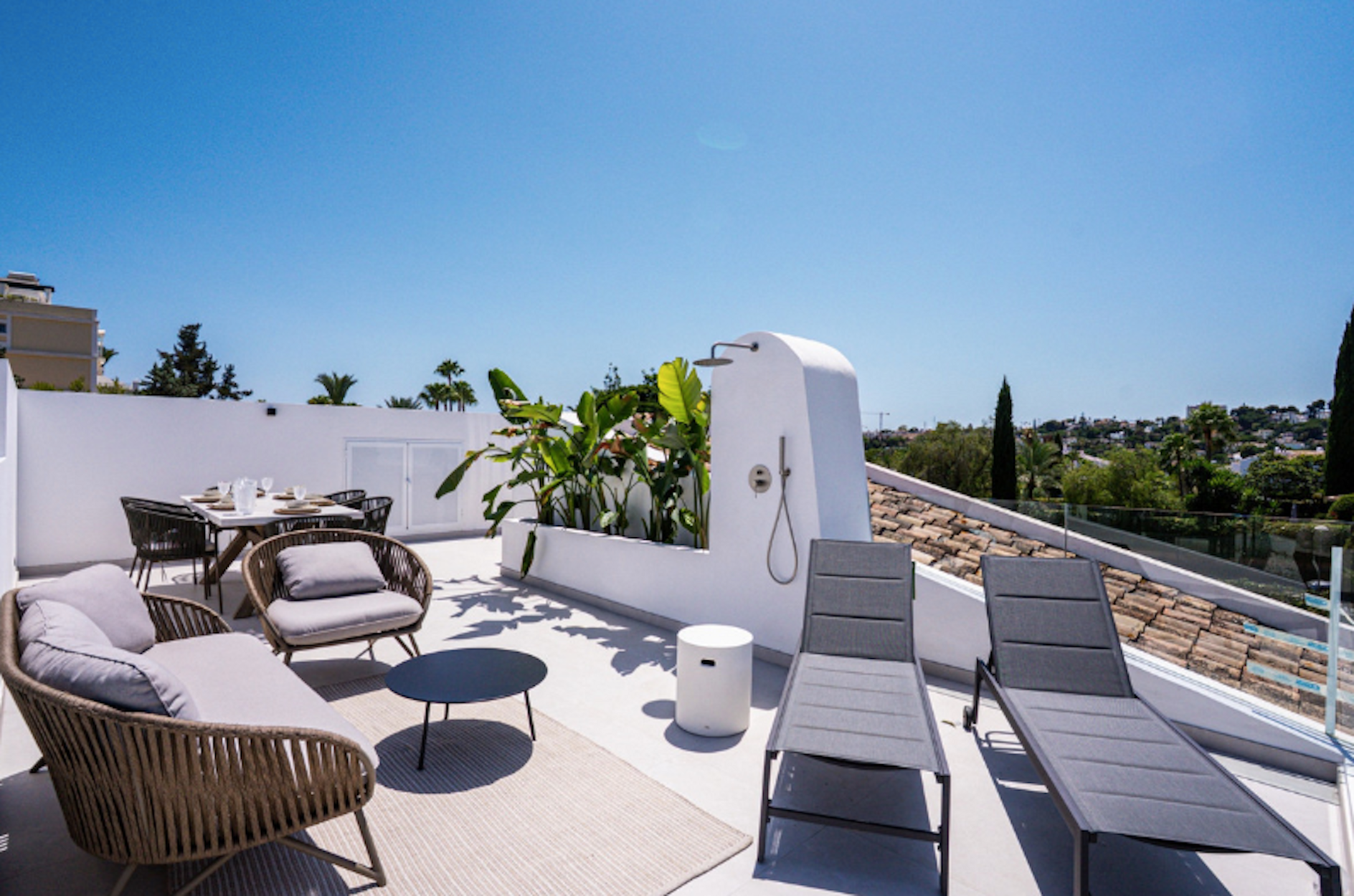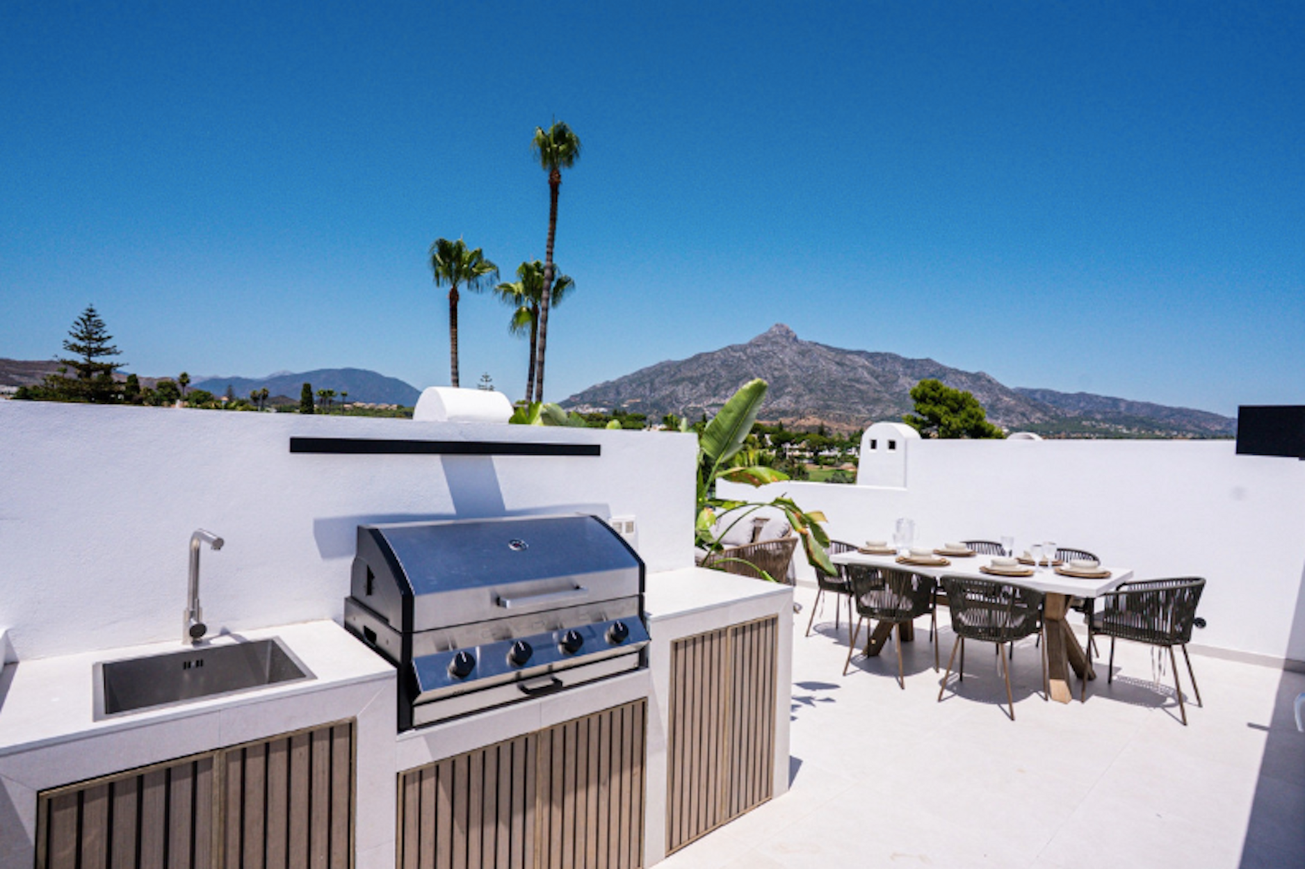 Por encima de todo, el solárium privado en la azotea es la joya de la corona de esta casa. Diseñado para la máxima relajación y entretenimiento, ofrece vistas panorámicas de 360° de la costa y la icónica montaña de La Concha. Aquí encontrará una barbacoa de obra, una cocina americana exterior totalmente equipada, un comedor, una ducha exterior y un amplio espacio para relajarse bajo el sol o las estrellas: un entorno idílico que define el lujoso estilo de vida mediterráneo.