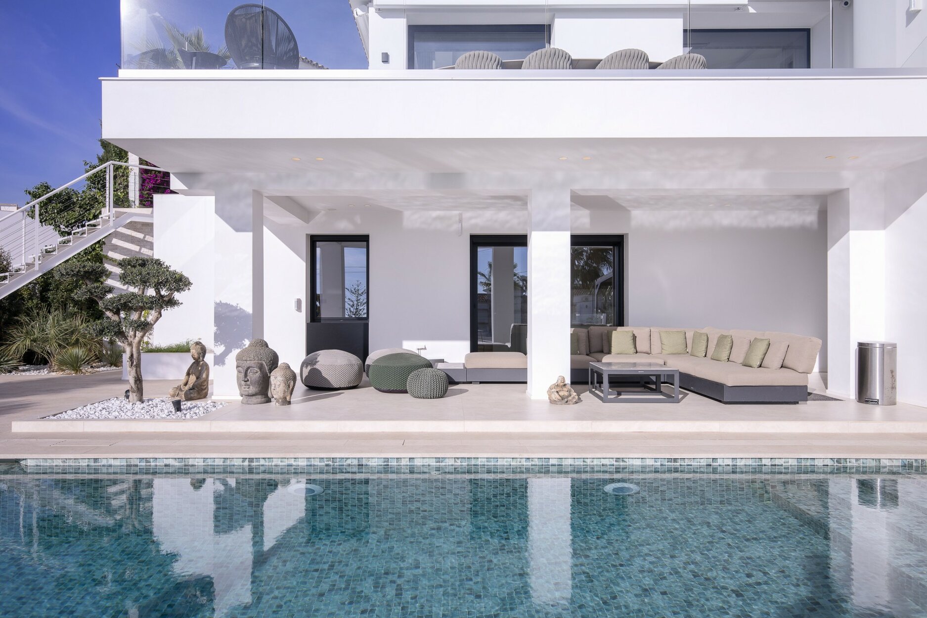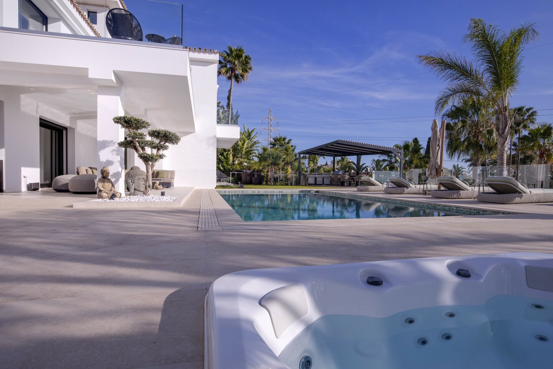 Esta villa ofrece 4 dormitorios con baños en suite, 2 aseos para invitados y mucho espacio de almacenamiento. La cocina de Porcelanosa está equipada con electrodomésticos Gaggenau y Miele. Además, la propiedad disfruta de una bodega y una hermosa zona de cocina y barbacoa de verano.
