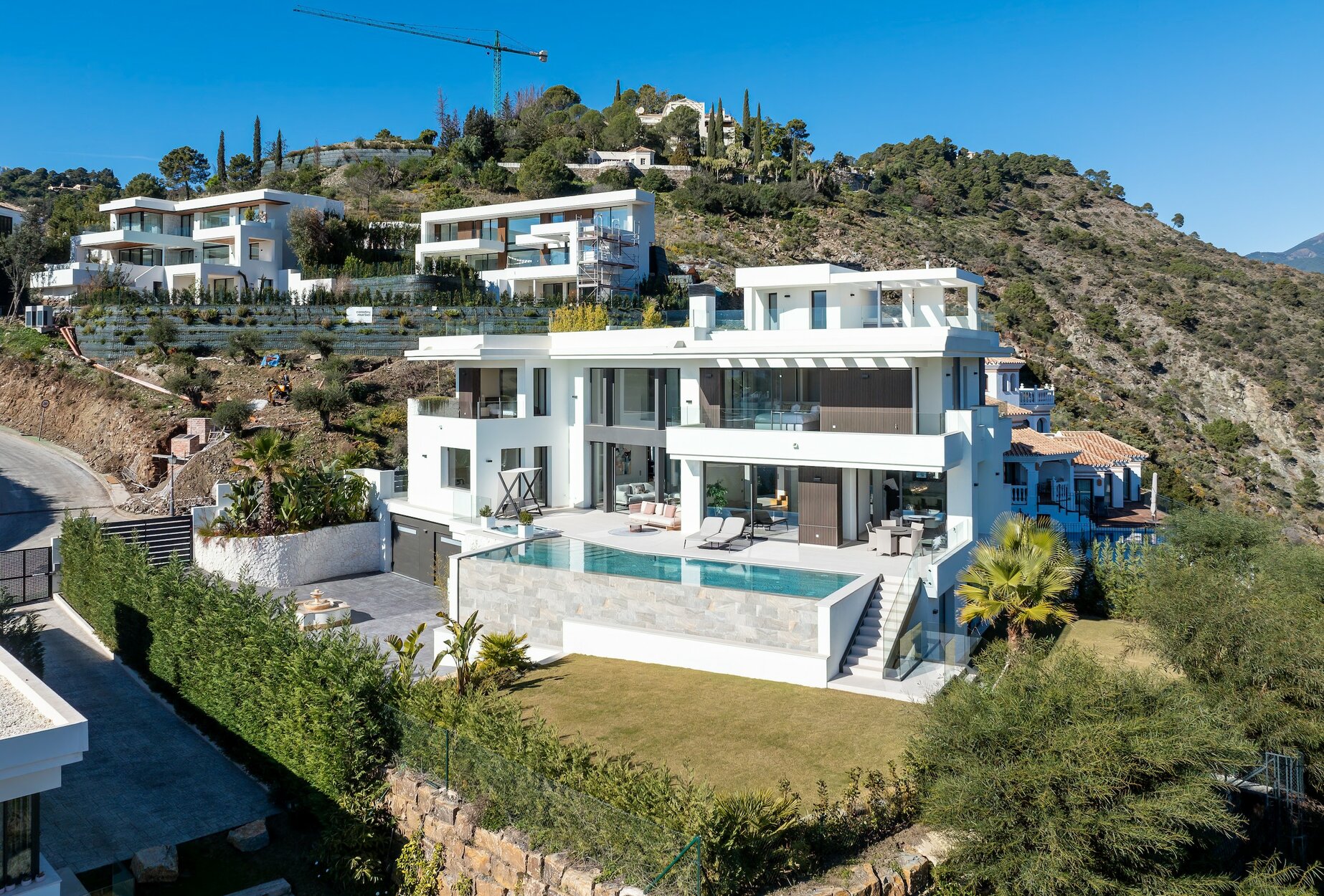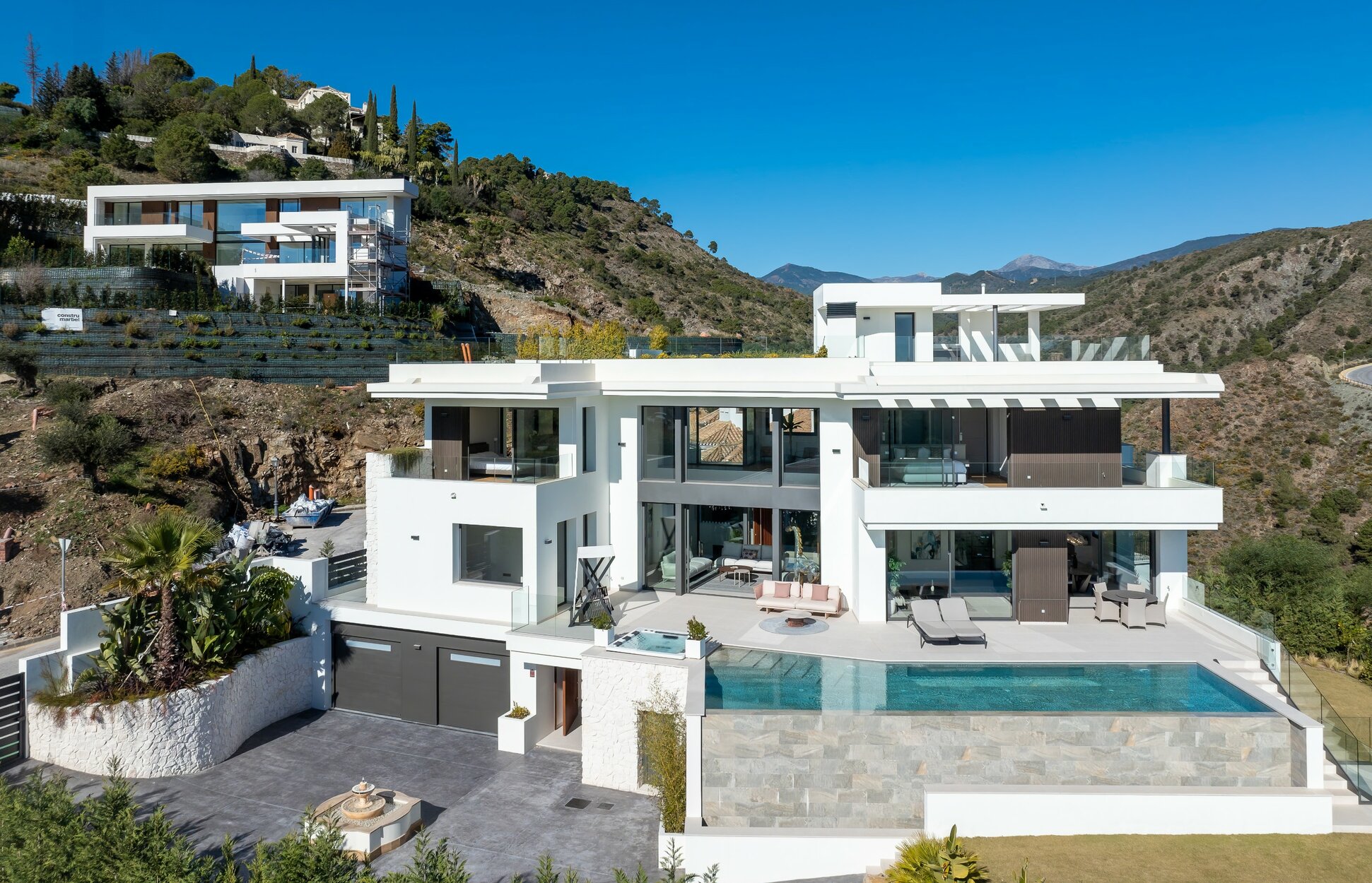 Los espacios exteriores son tan fabulosos como el interior de esta casa. Dispone de terrazas en todas las plantas; la principal, junto al salón, cuenta con una piscina infinita de agua salada, jacuzzi y da a uno de los jardines, donde se pueden disfrutar de las vistas al mar y a la montaña. El segundo jardín da al sótano y ofrece vistas a las montañas. Esta casa de nueva construcción ofrece todas las comodidades modernas, incluyendo un sistema de domótica, alarma, calefacción por suelo radiante y unas vistas impresionantes en una ubicación idílica, lo que la convierte en una casa familiar ideal, ya sea para vivir a tiempo completo o para disfrutar de las vacaciones de sus sueños.