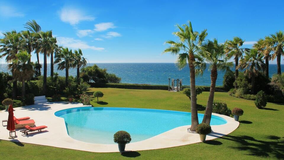 Una magnífica mansión frente al mar, que combina la elegancia del viejo mundo con todas las comodidades modernas. Un jardín de rosas con fuentes se encuentra en el centro del camino de entrada que conduce a la imponente entrada principal, que luego da al vestíbulo de entrada de doble altura con una escalera imperial y techo de vigas y una galería superior sostenida por columnas de madera. Desde el vestíbulo de entrada uno mira directamente a través de la espaciosa sala de estar a los jardines y al mar más allá. Otros alojamientos en la planta baja incluyen: 2ª sala de estar o sala de televisión, comedor formal, sala de estar grande y muy práctica con cocina abierta totalmente equipada que da a la terraza comedor de verano, comedor y sala de estar; lavadero, aseo de invitados y aseo de personal, despacho/biblioteca, y 2 dormitorios en suite. Un soberbio porche cubierto recorre casi todo el ancho de la casa. Planta alta: dormitorio principal en suite que consta de dormitorio, baño, 2 vestidores, salón y amplio solárium con inmejorables vistas al mar; 2 habitaciones familiares unidas por un pasillo corto con armarios y baño compartido; aseo adicional y 2 dormitorios más en suite. Hay calefacción por suelo radiante en toda la casa, siendo el suelo una mezcla de terracota, mármol y parquet. Sótano: zona de servicio y garaje de unos 30 x 20m.