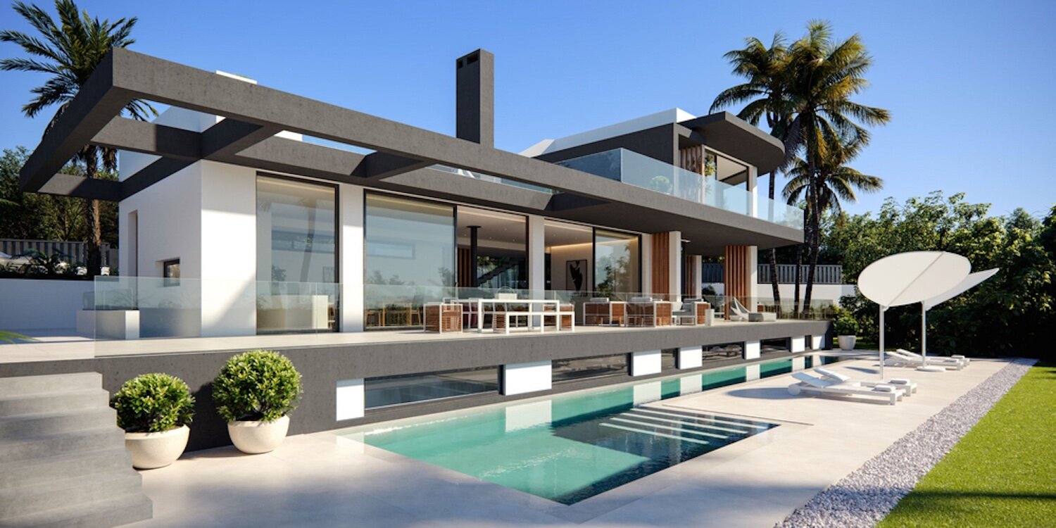 Planta inferior: salón, 4 dormitorios de invitados en suite, cine, gimnasio, trastero y lavadero. Acceso al jardín y piscina desde los dormitorios.