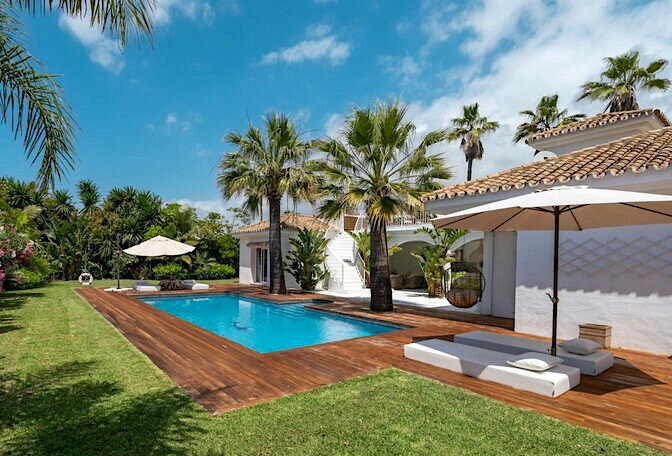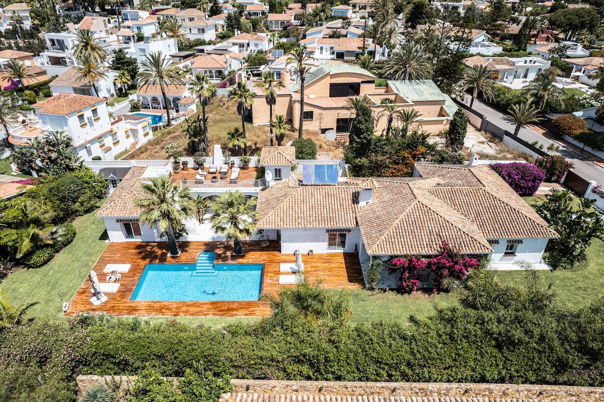 Rodeada de zonas verdes, pinares y propiedades de lujo de estilo tradicional y moderno de la prestigiosa zona, la encantadora villa de 322m2 con 188 m2 de terrazas se asienta en una generosa parcela de 1.857 m2. Expone la arquitectura mediterránea donde el estilo tradicional se enriquece con el encanto andaluz único. Orientada al sur, la casa disfruta de serenas vistas a la exuberante vegetación, una piscina privada y vistas parciales al mar. Se distribuye en una sola planta, además de solárium en la planta superior. Cuenta con un acogedor salón, una cocina totalmente equipada, 5 dormitorios, 5 baños y un aseo para invitados, un apartamento de invitados independiente, trastero y lavadero y un garaje para 2 coches. El mundialmente famoso estilo de vida mediterráneo se ve fomentado por las notables terrazas cubiertas y soleadas con salones al aire libre, áreas para comer y barbacoa al aire libre, una piscina de agua salada con terraza de madera y un solárium rodeado de jardines subtropicales.