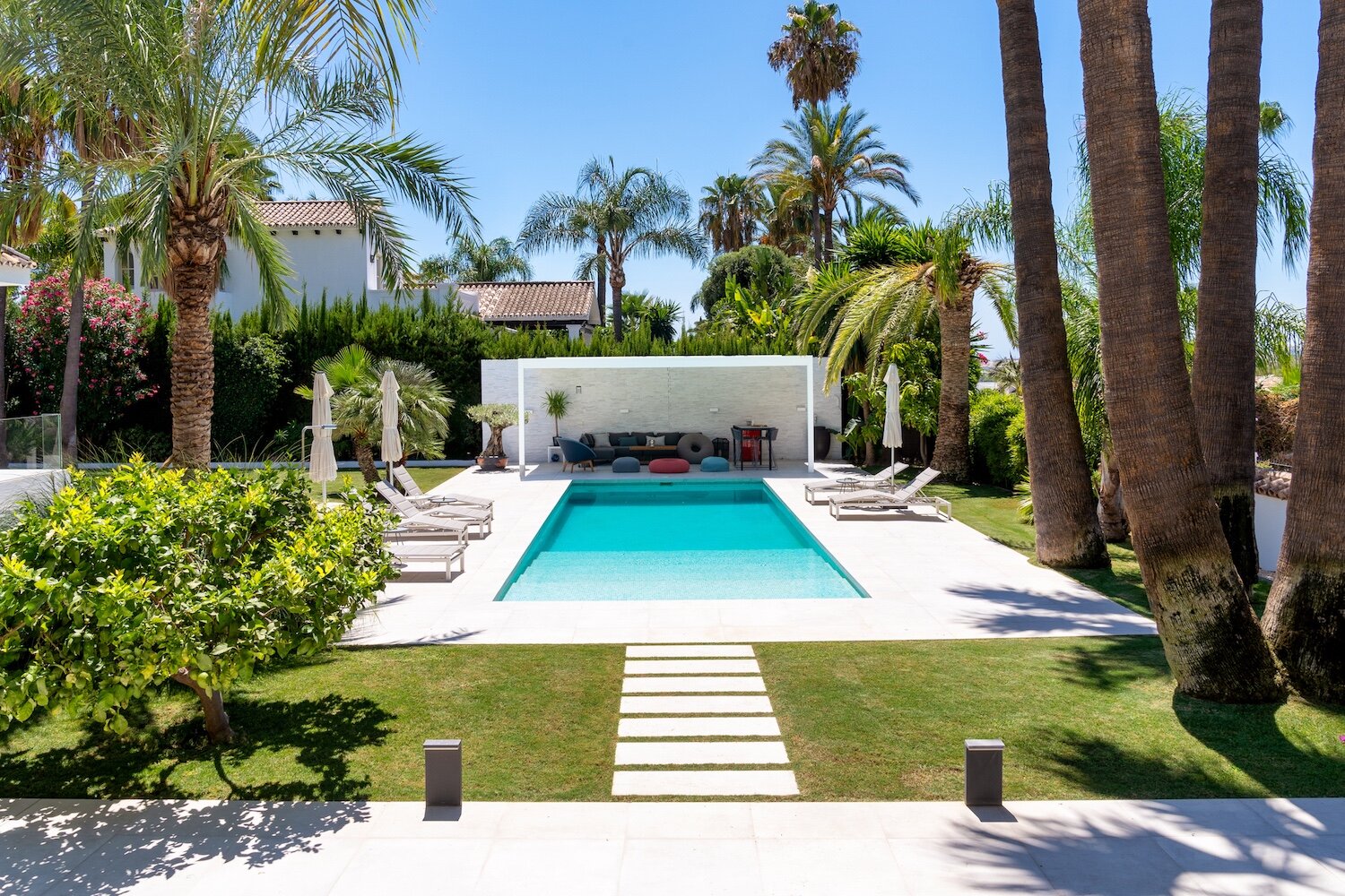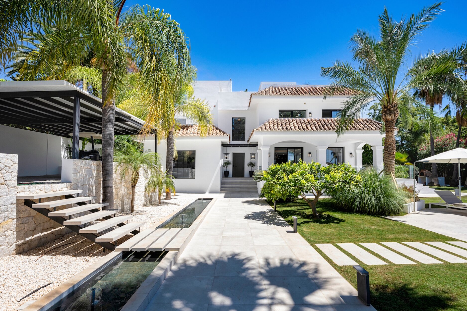 Reflejando una arquitectura clásica y atemporal y con una ubicación privada justo entre dos campos de golf en una calle apartada, con vistas al Mediterráneo y al valle del golf, esta es una de las mejores residencias inmobiliarias ofrecidas a la venta en Nueva Andalucía. Completamente renovada en un estilo moderno, con interiores a medida cuidadosamente diseñados, la villa se distribuye en tres plantas. En la planta baja ofrece una amplia sala de estar y dos cocinas: una abierta, interior y una zona de cocina exterior. Este nivel también incluye dos dormitorios, uno en suite, y un aseo para invitados. El dormitorio principal está ubicado de forma privada en el primer nivel, junto con dos dormitorios más en suite con terrazas. La terraza de la azotea estilo spa y salón ofrece sauna, jacuzzi y zona de salón con vistas al mar. El sótano de la residencia estaba destinado a relajarse y entretener: sala de televisión, bodega, gimnasio, lavandería y trastero. El jardín y la zona de la piscina son un paraíso subtropical privado, con numerosas palmeras grandes, zona de salón y horno de pizza. Pisos con calefacción en todos los baños. Nuevo aire acondicionado, electricidad, sistema de rociadores. Sistema de alarma, fibra, paneles solares para calentar agua. Aparcamiento para dos coches.