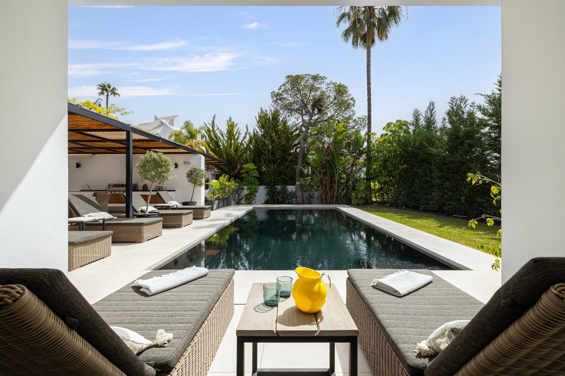 Residencia familiar diseñada por AMES situada en una tranquila calle sin salida, a poca distancia de Los Naranjos Golf en Nueva Andalucía. La propiedad está idealmente distribuida, tiene una sala de estar y comedor de planta abierta de doble tamaño que conduce a una cocina moderna totalmente equipada. El salón y el comedor están separados por una chimenea de doble cara que complementa perfectamente la habitación. La amplia terraza y el jardín cuentan con una barbacoa incorporada, cocina al aire libre y junto a la piscina orientada al sur, absolutamente ideal para vivir y entretenerse al aire libre. Los 5 dormitorios en suite son amplios y tienen armarios empotrados. En el nivel inferior hay una bodega con una encantadora zona de estar, una acogedora sala de televisión, un lavadero y un gimnasio equipado. Con una cocina equipada Gaggenau, acabados de alta calidad, calefacción por suelo radiante, música y sistema domótico, esta es realmente una villa elegante. Una propiedad excepcional, idealmente ubicada en el valle del golf y que ofrece vistas al golf y a la montaña, muy cerca de todos los servicios en una exclusiva zona residencial.