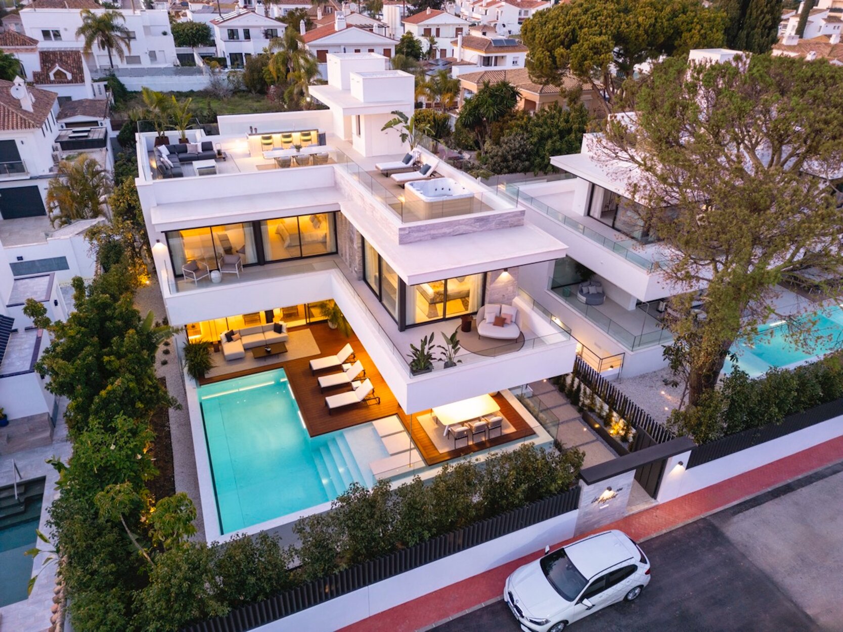 La terraza de la azotea es una característica de estilo de vida que distingue a la villa, estableciendo el tono para los días y las noches que se pasan en el jacuzzi, el salón y el comedor servidos por un bar y una cocina profesional al aire libre, con el impresionante telón de fondo de la cercana mar.