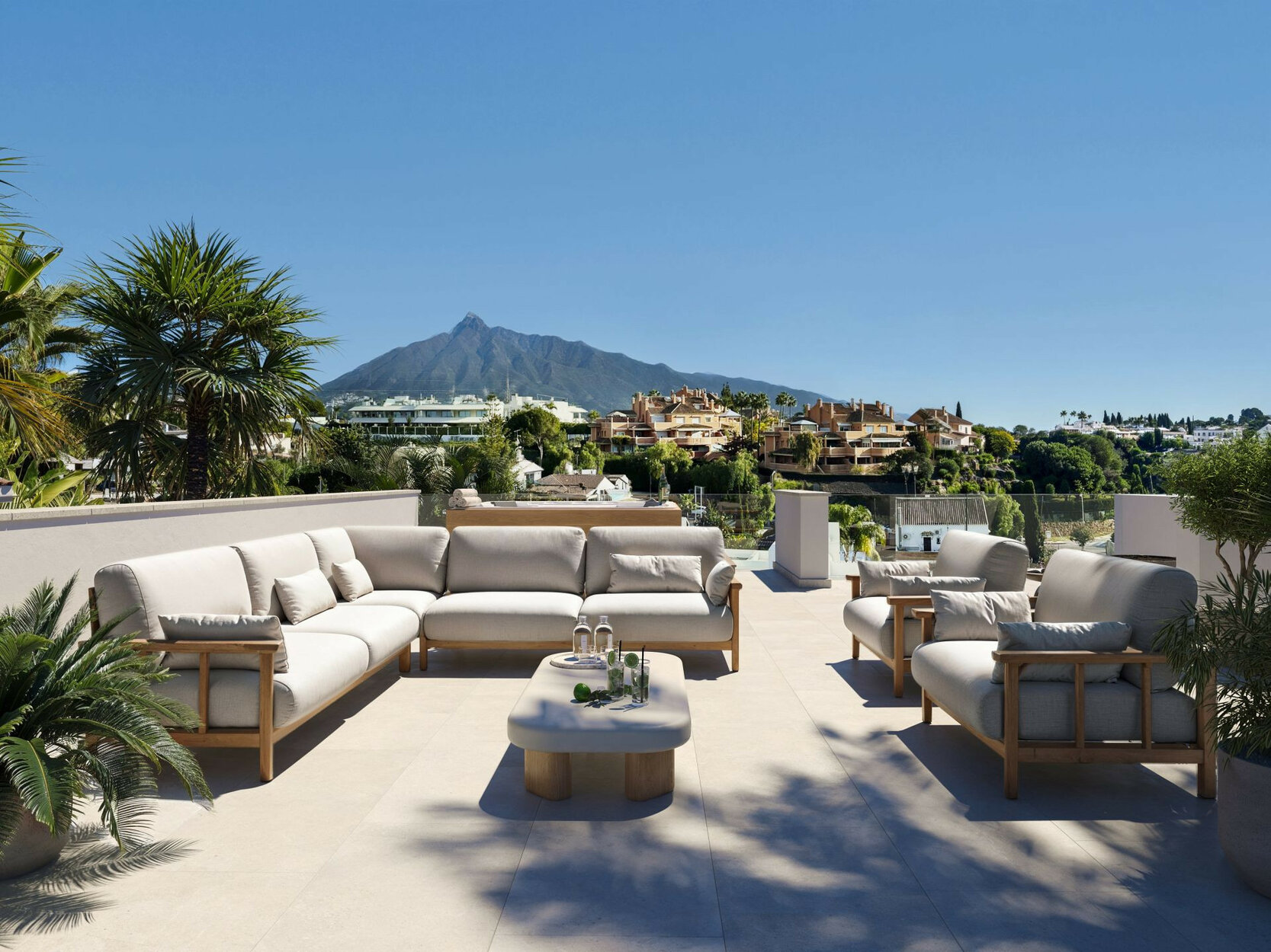 Una terraza en la azotea realza el atractivo, con jacuzzi y vistas panorámicas de 360°. Ya sea para practicar yoga al amanecer o disfrutar de cócteles al atardecer, este espacio elevado captura lo mejor de la vida mediterránea al aire libre. Los interiores lucen acabados de alta calidad, como suelos de porcelana, armarios de madera a medida y elementos de piedra natural, que aportan un diseño cálido y refinado.