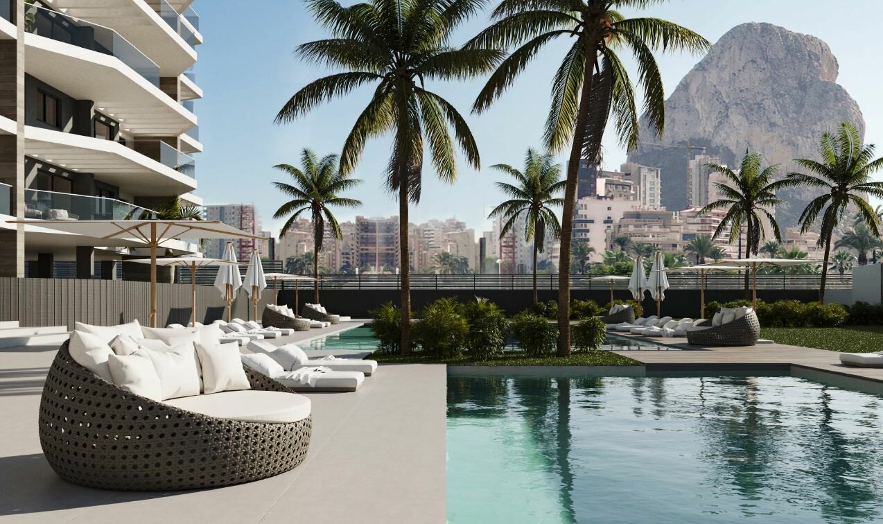 Apartamentos de lujo Jade en venta en CalpeApartamentos Jade son nuevos apartamentos de lujo disponibles para comprar en Calpe, situados en la costa junto a la zona principal de la playa, y también el centro de la ciudad está a solo 5 minutos a pie de los apartamentos.Los apartamentos disponen de amplias terrazas balcón privado con vistas al mar.Los apartamentos Jade están situados justo detrás de la playa principal de Playa del Arenal Bol, una ubicación céntrica junto a una playa de arena ancha de 1,4 km de largo con aguas turquesas transparentes y poco profundas que son seguras para familias con niños pequeños. Un paseo marítimo flanqueado por tiendas, restaurantes y bares corre detrás de la playa y te lleva desde el centro de la ciudad hasta el puerto deportivo.En las inmediaciones, a solo unos minutos a pie de los apartamentos, hay un supermercado y varias tiendas.Los apartamentos Jade se están construyendo en una parcela con un paisaje llano de 5.900 m2, con hermosos jardines con plantas mediterráneas y palmeras, y una amplia terraza para tomar el sol. Hay dos grandes piscinas abiertas, una para adultos con una función de playa y la segunda piscina diseñada para niños.Además, dentro de los jardines hay una pista de pádel, una zona para guardar bicicletas y un parque infantil, todo ello alejado de la zona de la piscina.Calidades Apartamentos JadeAmplia cocina abierta al living, equipada con modernos muebles altos y bajos, electrodomésticos integrados, y sobre y salpicadero de Porcelánico de gran formato.Los baños cuentan con sanitarios suspendidos de Porcelánico Verificado, gres porcelánico de primera calidad, plato de ducha y mampara de resina blanca de gran formato.Pisos de porcelanato de alta calidad con opciones de color para que los clientes elijan.Climatización de frío y calor por conductos, con bomba de calor AEROTERMIA de bajo consumo. Existe una opción adicional para tener control de habitación individual AIRZONE.Carpintería exterior de aluminio con puente de insolación para el máximo confort y eficiencia.Control automatizado de persianas y aire acondicionado.Conexiones de TV-TDT-SAT-Teléfono en la vivienda y balcones principales, además de cableado para internet por fibra óptica.Puntos de carga USB en salón y dormitorios.Apartamentos Jade - Personalización disponibleCuando compra un apartamento en Jade Apartments, el equipo de diseño puede ayudarlo a personalizar su apartamento con una amplia variedad de materiales de alta calidad para elegir, las paredes, los pisos y las cocinas pueden tener colores personalizados.Tipos de apartamentos disponibles.Hay varios tipos diferentes de apartamentos disponibles para comprar en Jade Apartments, cada piso tiene 3 apartamentos a la venta y el último piso tiene dos espaciosos áticos a cada lado del edificio. El edificio dispone de 37 viviendas con 2 ascensores de pasajeros que comunican todas las plantas incluyendo los niveles de aparcamiento.Puede elegir entre apartamentos de 2 y 3 dormitorios, elija el piso que prefiera y también la posición dentro del edificio dependiendo de si prefiere terrazas con balcón con orientación sur, este u oeste.Se incluye una plaza de aparcamiento privada subterránea segura, las plazas de aparcamiento con preinstalación de puntos de recarga para vehículos eléctricos.Apartamento Tipo A-3 (108'95 m2)El apartamento tipo A es un apartamento de tres dormitorios y dos baños situado en el lado oeste del edificio, hay dos balcones terraza, uno al sur del edificio que da a la sala de estar, este balcón mide 14'10 m2 y tiene vistas al mar. Una segunda terraza balcón lateral de 11,75 m2 se sitúa al oeste del edificio con acceso desde el dormitorio principal en suite y uno de los dormitorios de invitados. El salón es un espacio diáfano, y todos los dormitorios tienen armarios empotrados.Apartamento Tipo A-3+ (112'75 m2)También situado en el lado oeste del edificio pero en plantas con números impares, el apartamento tipo A+ tiene una distribución de habitaciones casi idéntica a la del apartamento tipo A con las mismas dimensiones internas, este apartamento tiene terrazas con balcón un poco más grandes que miden 14'1 y 11'75 m2.Apartamento Tipo B-3 (103'95 m2)El apartamento tipo B3 es un apartamento de tres dormitorios y dos baños con un gran balcón terraza de 23'70 m2 al sur del edificio. Los tres dormitorios tienen armarios empotrados, hay dos baños elegantes y una cocina moderna totalmente equipada abierta a la sala de estar.Apartamento Tipo C-3 (108'95 m2)El apartamento tipo C está situado en el lado este del edificio, con un balcón con vistas al mar hacia el sur que se abre desde la sala de estar y un segundo balcón terraza hacia el este con vistas al Lago Salado. El apartamento tiene tres dormitorios con armarios empotrados, dos baños contemporáneos (uno en suite), un armario de almacenamiento con lavadora y una sala de estar y cocina de planta abierta.Apartamento Tipo C-3+ (112'75 m2)La misma posición y espacio interior que el apartamento tipo C, algunos m2 adicionales se encuentran en las terrazas de los balcones.Apartamento Tipo A-2 (98'20 m2)Piso de dos dormitorios con una superficie de 98'20 m2, el piso dispone de dos amplias terrazas balcón, dos dormitorios dobles con armarios empotrados, dos baños uno de ellos en suite encima del dormitorio principal, armario lavadero y salón diáfano plan de espacio habitable y cocina equipada moderna.Apartamento Ático Tipo A (144'00 m2)Magnífico ático con increíbles vistas al mar frente a la costa de Calpe, el apartamento cuenta con un gran dormitorio principal en suite, dos dormitorios de invitados con armarios empotrados y un baño de invitados, armario lavadero, cocina moderna con isla central y zona de comedor, un impresionante balcón de 45'60 Terraza envolvente a dos lados del edificio.Apartamento Ático Tipo B (144'00 m2)Una imagen de espejo idéntica al tipo A, la única diferencia es que 