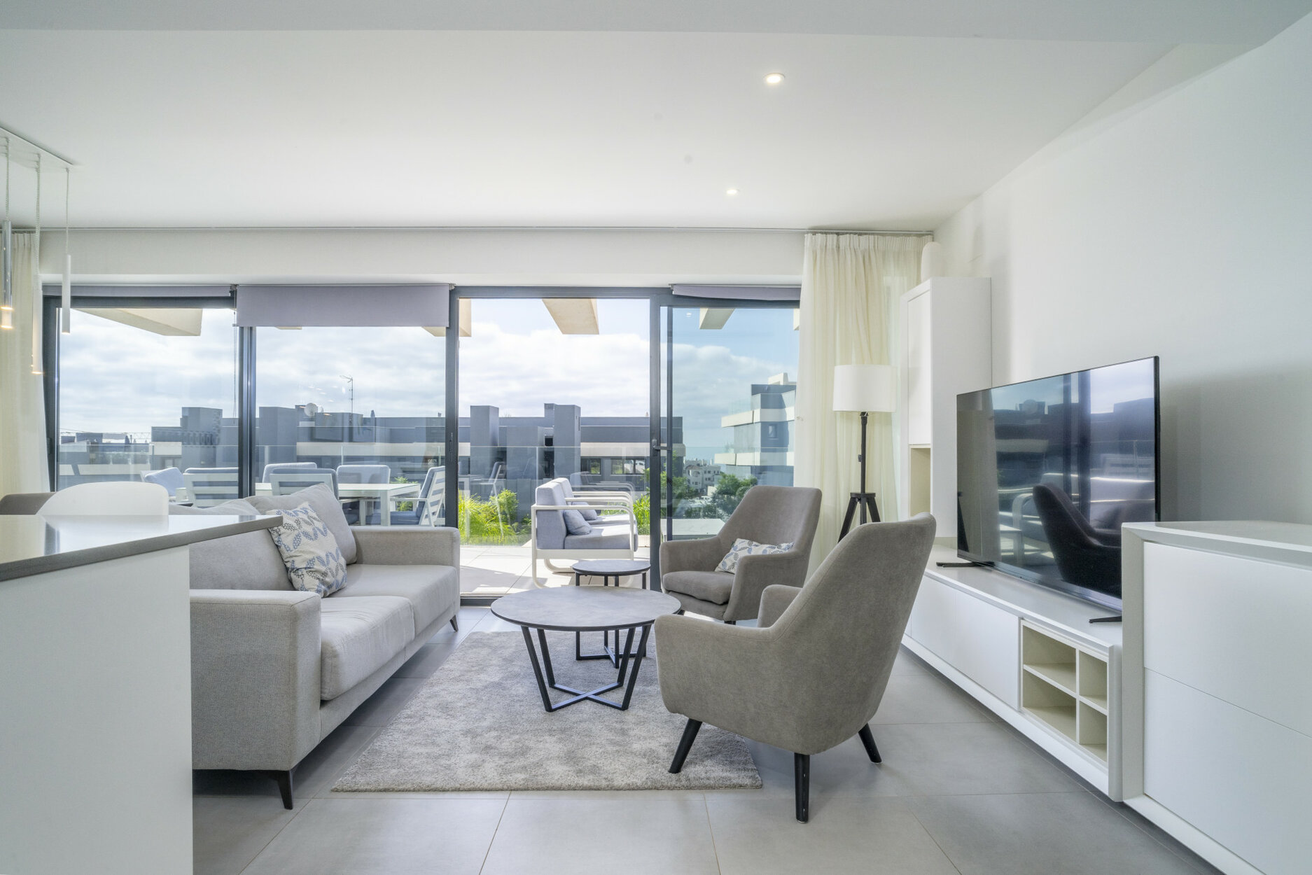 El apartamento cuenta con una distribución diáfana con un luminoso salón-comedor, una cocina contemporánea totalmente equipada y acceso directo a una generosa terraza privada, el lugar ideal para disfrutar del sol y la brisa marina. Los tres dormitorios bien distribuidos incluyen una lujosa suite principal, diseñada para la máxima comodidad y relajación. Se vende totalmente amueblado, incluyendo mobiliario exterior. Historial probado de rentabilidad en alquiler.