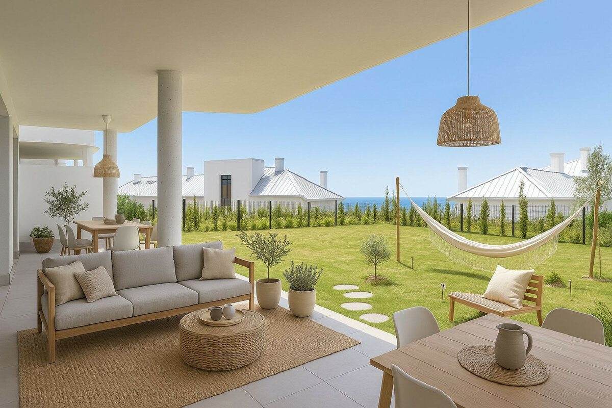 La cocina abierta y el salón conforman el corazón del hogar. La cocina es moderna y elegante, equipada con electrodomésticos de alta calidad y mucho espacio de almacenamiento, mientras que las superficies de fácil mantenimiento facilitan la vida diaria. El salón se conecta de forma fluida con el comedor, creando un ambiente acogedor para reuniones familiares o con amigos. Desde aquí, las puertas se abren directamente al jardín, permitiendo disfrutar del aire libre, del sol y de la relajación cada día.