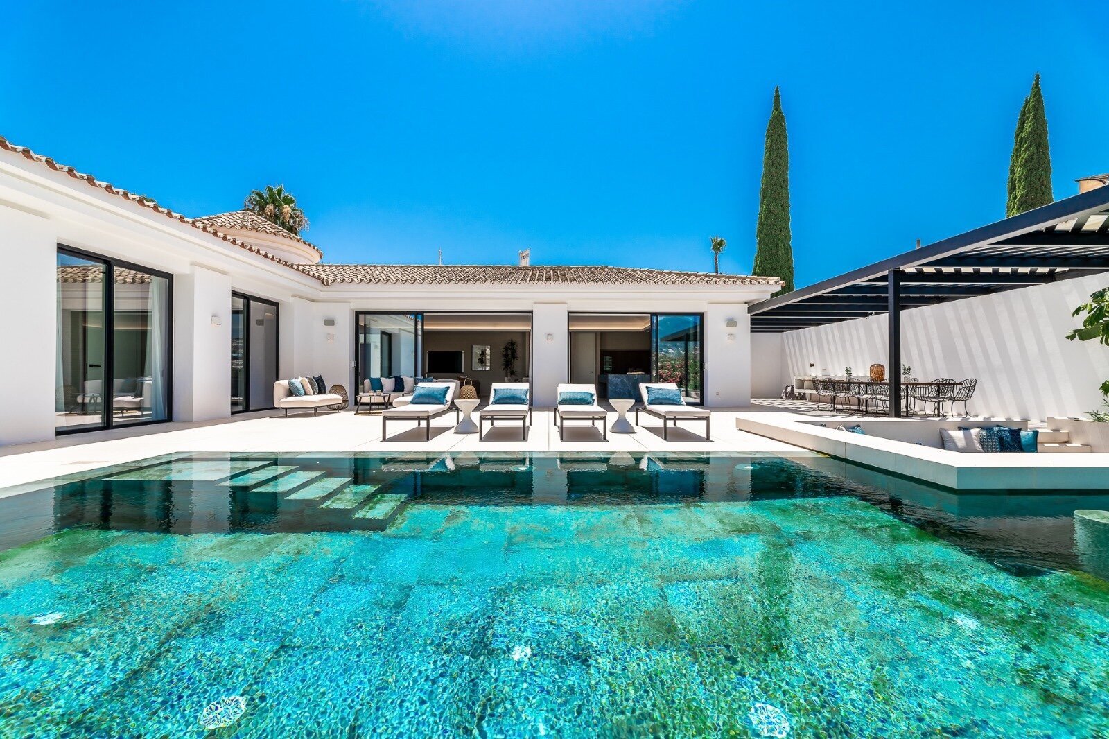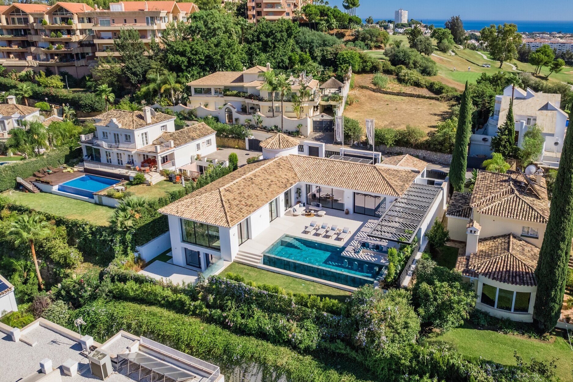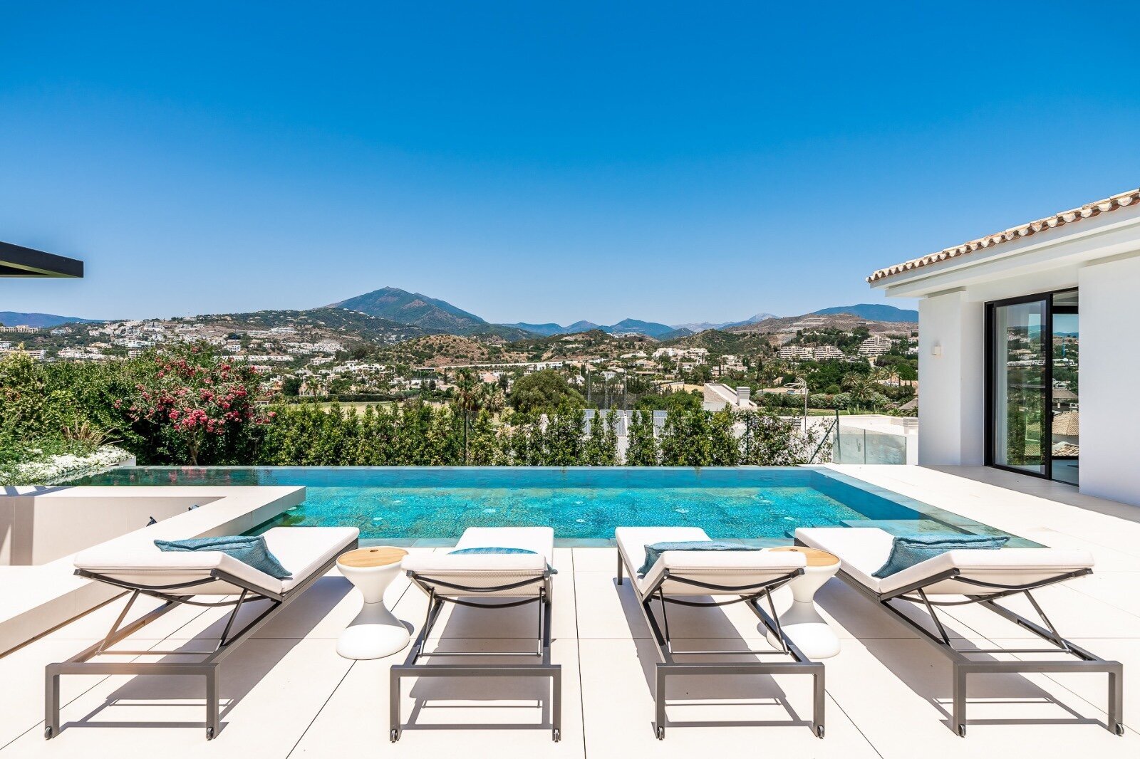 An extremely stylish residence built to the highest specifications and located in Marbella in the heart of the prestigious Golf Valley and walking distance to the clubhouse. The property is unique in offering most of the accommodation and living areas on one level from where spectacular views across to th golf course and the mountains beyond can be enjoyed. The spacious open plan, double sized living room, dinning room and designer kitchen with impressive floor to ceiling windows have access to an expansive exterior terrace that features various seating areas, BBQ area, chill out area and the infinity pool. Three large bedroom suites including the master bedroom are on this same floor. On the lower floor two further guest bedroom suites and television / club room. This is an outstanding designer villa, created to offer and optimize comfort and modern living.