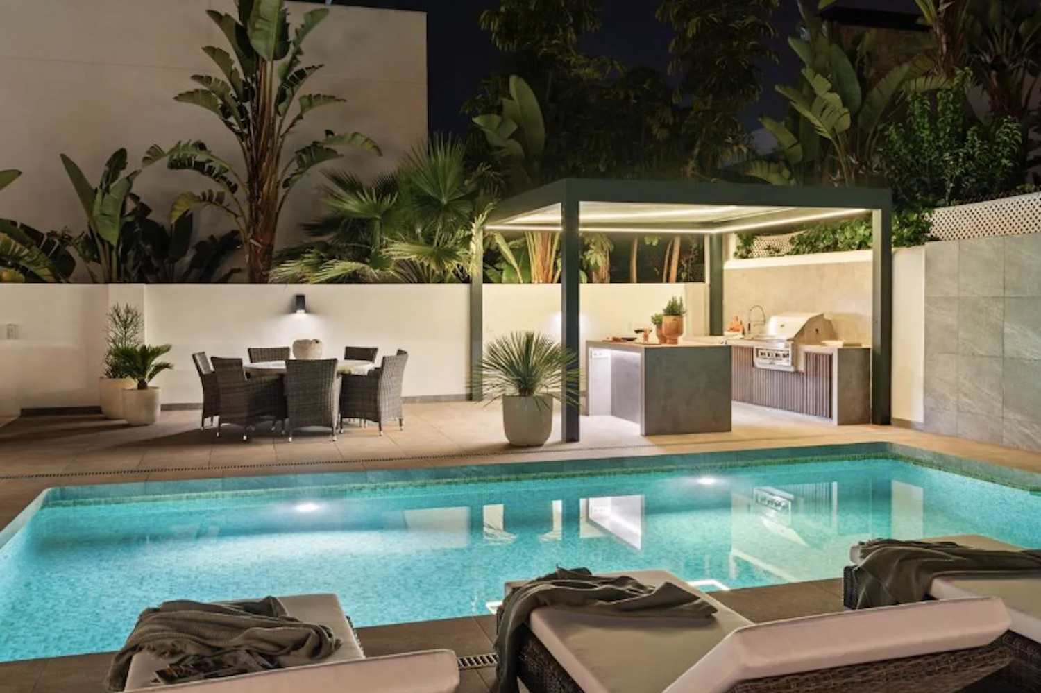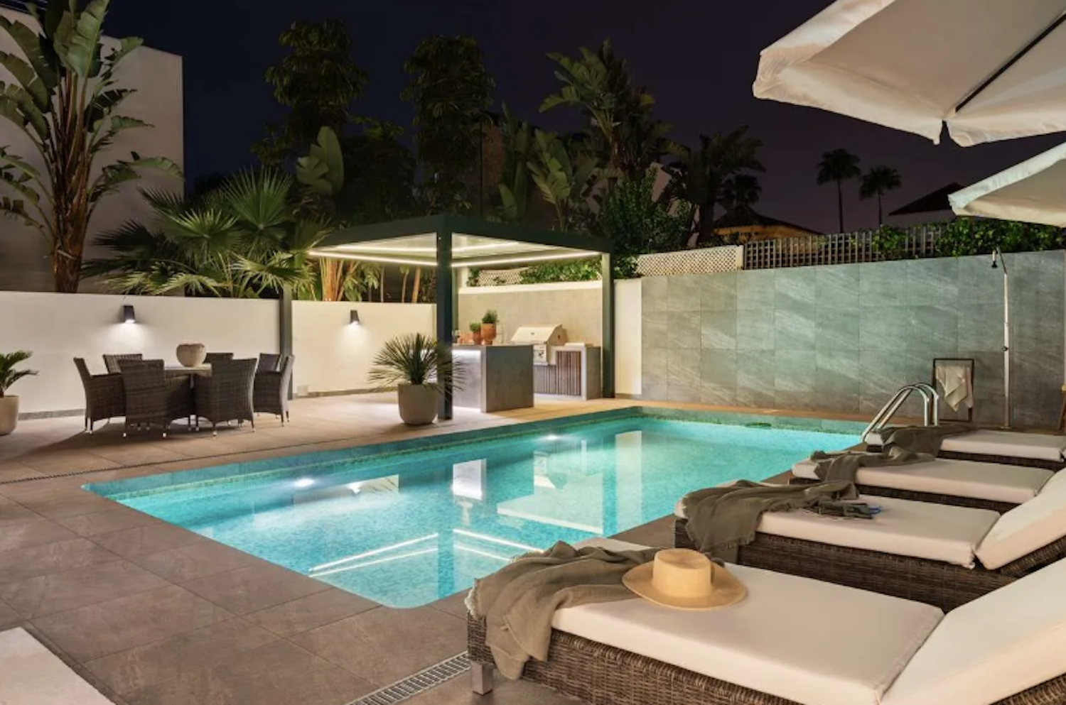 Welcome a modern renovated villa in a central location within less 10 minutes walk to the beach! The layout is as follows: The ground floor has an open plan modern kitchen – dining & living room area leading into the terrace and garden area with a private pool, there are also 2 ensuite double bedrooms on this level. On the first floor there is a master bedroom with an ensuite bathroom and a large private terrace area. The villa is located in the heart of Nueva Andalucia with easy access to the beach and Puerto Banus & San Pedro. It’s a great investment property and will very high rental income because of the villas AAA+ location. Key at the office for easy viewings!