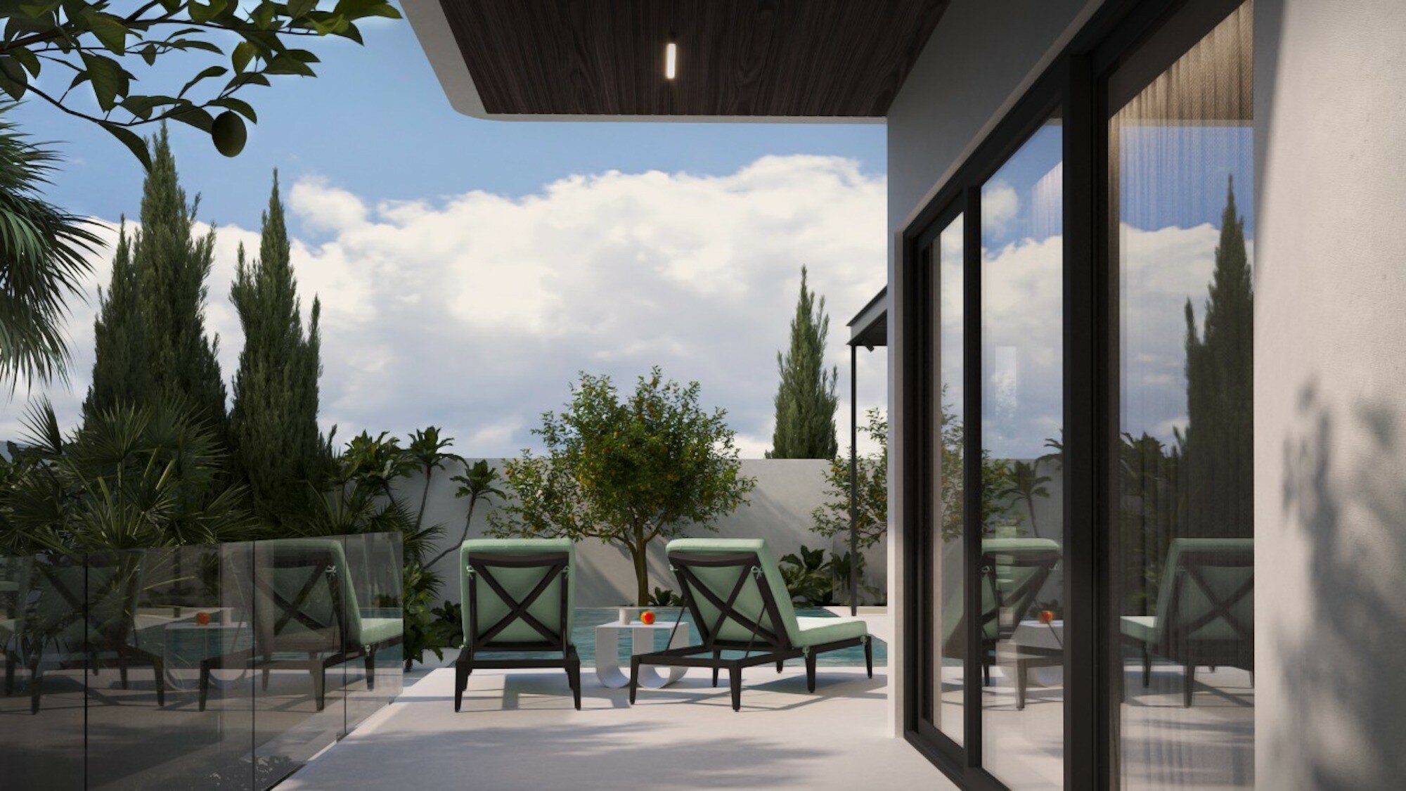 Bright living room with access to the garden and private pool (approximately 3 x 8 m). Separate kitchen with dining area connected to the exterior.