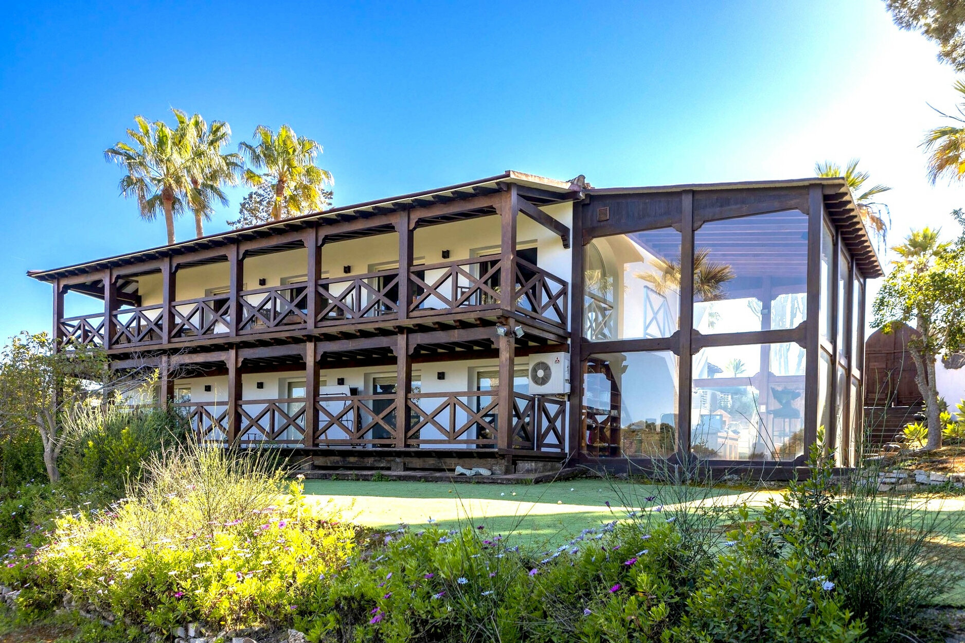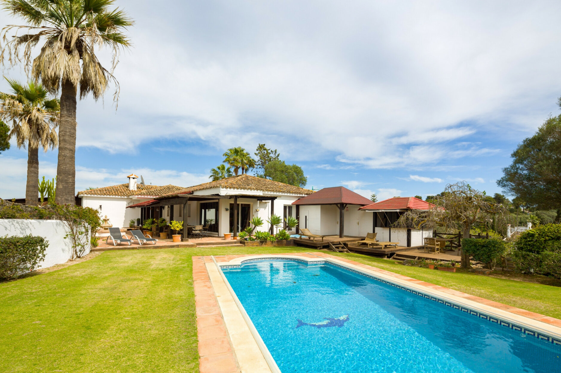 Lush Colonial-style villa, peacefully located at the end of a Cul de Sac, with mature gardens and ample terraced and decked areas. Offering Jacuzzi and sauna, bar and BBQ, all ideal for summer outside living. In the main house, the first floor offers an entrance hall, a guest cloakroom, 3 bedrooms and bathrooms, office/study area, a large open plan living space and super kitchen. On the lower ground floor is a double bedroom and a separate shower room, a double bedroom with en-suite bathroom, a games room, bodega and a sun room with a staircase to the first floor decked terrace. In the garden is summer/guest house with kitchen, sitting room and a double bedroom and a bathroom. Other features are: underfloor heating on the main floor and some split A/C units.