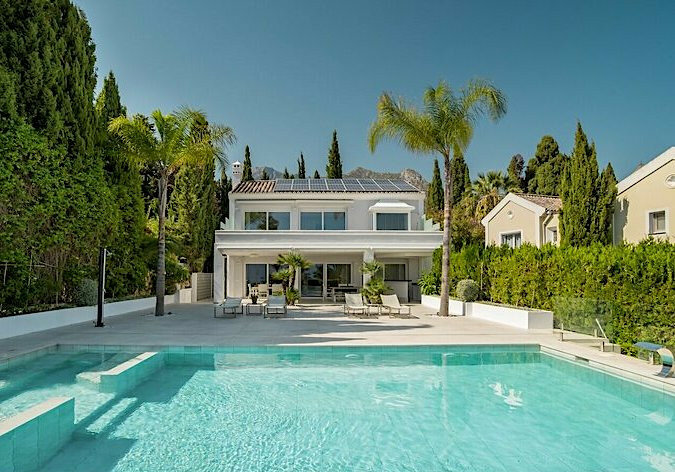 Welcome to a beautifully renovated 5 bedroom 5 bathroom villa, located in Balcones De Sierra Blanca, offering spectacular sea views. The home is ideally located down a quite cul-de- sac, sat at the foothill of Sierra Blanca in one of the most sought after areas of Marbella. As you reach the entrance of the property you are greeted by an elevated plot high off the road level, offering important privacy and a large set of security gates with video entry. As you enter the main door you get a true feel of space and brightness and quality with a large open plan living, dining and kitchen area with a private home office and washroom coming off the main areas. The fully equipped kitchen is a beautiful design finished in high quality soft close wooden cabinets and a natural stone counter top, which has been book marked throughout, which leads in to a very large open plan living space, with fireplace and a built in temperature controlled wine fridge. Large double glazed and solar specification sliding doors, let in an abundance of light and open up to the outdoor terrace and pool area. Here you will find a covered alfresco dining area and outdoor bar area for day time dining and evening enjoyment, which also includes and outdoor BBQ area, pizza oven, and a large uncovered south facing terrace and pool area. Continuing upstairs to the 1st floor, you are then greeted by three ensuite bedrooms. Directly in-front you have the very spacious primary bedroom with large ensuite bathroom, and very large wardrobe and dressing room area, with a separate vanity area. From the primary the most incredible views are offered from the privateterrace out to sea and across the coast line, making this spot especially charming in the evening. With a large newly renovated heated pool, with built in jacuzzi and waterfall functions, you can enjoy the sea views and privacy that the home offers while taking in the amazing atmosphere of the area. Due to the layout of the upstairs floor plan, its the perfect house for a family meaning children are close by in their own rooms, but still far enough away offering privacy. Due to the distribution and how this area is used it works as a perfect entertainment area for guests or separate living area for live in staff. Off this level you then have a utility/laundry room and access to the large closed off garage which can accommodate 3 cars and also access to what has been made into a gym/dance studio. The property offers a well done renovation, with qualities used throughout in all areas, underfloor heating throughout, air zone air conditioning in all rooms, solar panels on the roof for energy efficient use and lower energy bills. All in all this property is a fantastic opportunity to own superb home in a superb area.