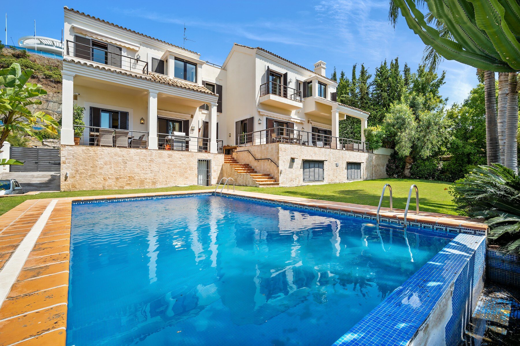 Fantastic five bedroom, south facing villa in La Quinta, Benahavis; just a short drive from local amenities, Puerto Banus and Marbella. The property has a spacious entrance hall leading to a large living room; fully fitted kitchen and dining room; and a guest toilet. From all rooms on this level, you can access the terrace, private garden and swimming pool which boast lovely views to the sea and golf course. The first floor has the master suite with vaulted ceilings, walk in closet and bathroom; two guest bedrooms; and a guest bathroom. The lower level of the property has a kitchen and dining area with independent access from the garden; two guest suites; and a cinema room. Other features include hot and cold air conditioning, alarm, demotic system, electric shutters and a private garage.