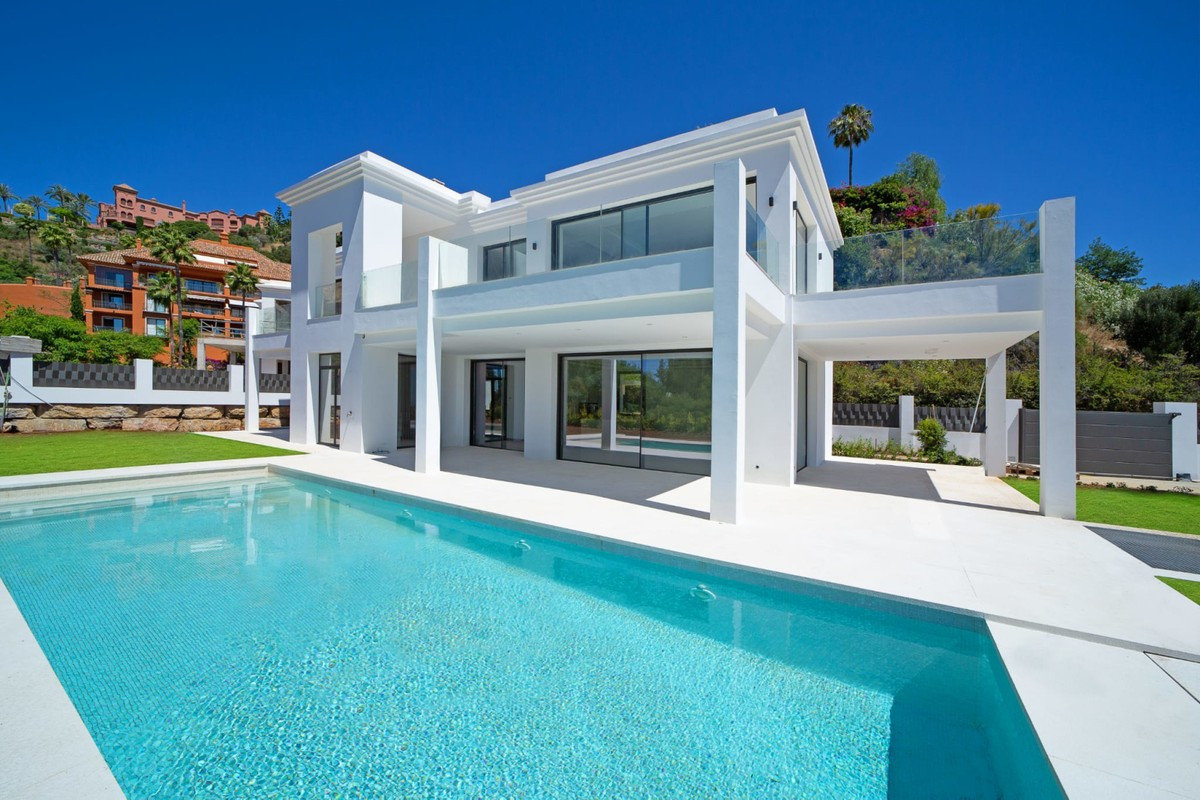 New contemporary five bedroom villa, South-West facing with sea views, located in Monte Halcones, a luxury residential area just minutes from Puerto Banús and Marbella.