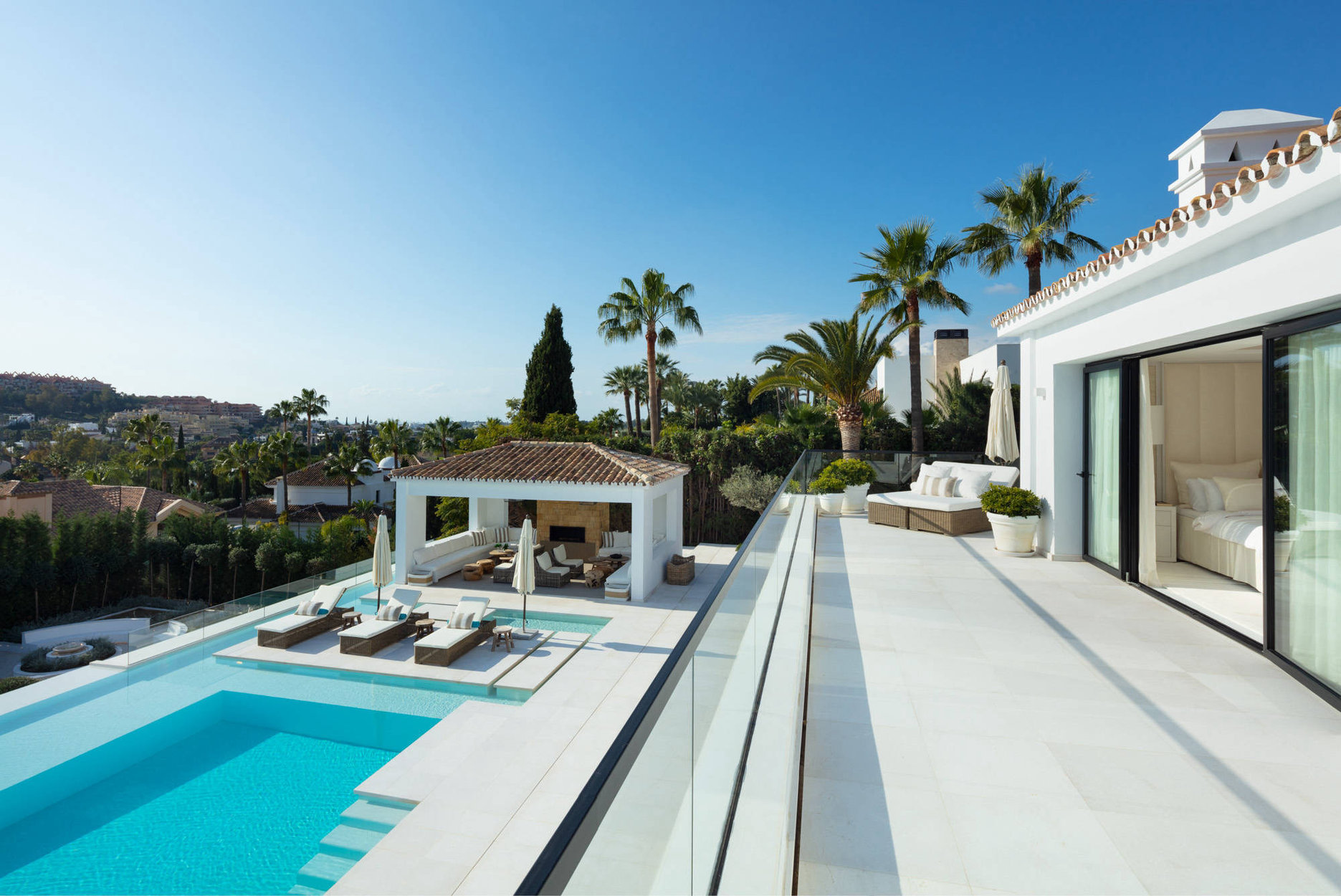 Singular residence, designed to amaze and enchant, with fabulous sea and mountain views, set in the exclusive enclave of La Cerquilla, Nueva Andalucia. This three-level residence offers spectacular views of the Mediterranean Sea and is surrounded by lush greenery, ensuring privacy and tranquility. The property’s outdoor spaces are a masterpiece, featuring an infinity pool with a sunken chill-out area, a pergola with a fireplace and numerous strategically placed chill-out areas. The expansive plot includes an extravagant garden, a private padel court and an al fresco dining space with a barbecue, all accessible via a private driveway for added convenience and security. Step inside to experience the seamless blend of Mediterranean architecture with a modern twist. The interiors are a testament to elegance and attention to detail, with a formal living area leading to an open-plan layout for informal living, dining and a modern kitchen. The kitchen boasts state-of-the-art appliances, ample storage and a central island, all with breathtaking views of the sea. The residence features four large en-suite bedrooms, each meticulously decorated, while the grand master bedroom steals the spotlight with a fireplace, walk-in closet and a luxurious bathroom with a shower, standalone tub and double vanity. The master bedroom offers direct terrace access, providing residents with unparalleled views and added luxury. Beyond the exquisite living spaces, this property elevates the standard of living with bespoke amenities. Residents can indulge in a home cinema, a treatment room and a SPA that includes a Jacuzzi, Turkish bath and sauna. This residence is not just a home, it’s a sanctuary where elegance meets functionality.